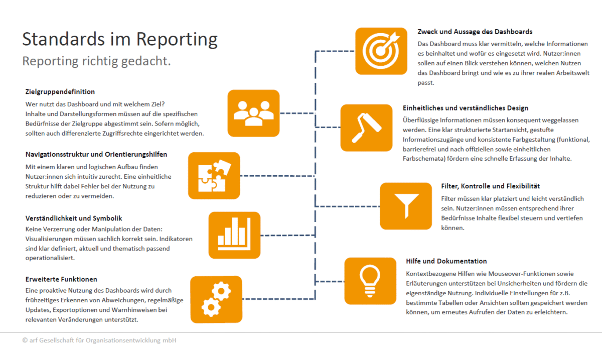 Unser arf Reporting Handbuch schlägt die Brücke zwischen Berichtsstandards und Best Practices. So entstehen Dashboards, die nicht nur funktional und verständlich, sondern auch im kundeneigenen Design und angepasst an die individuellen Bedürfnisse der jeweiligen Organisation gestaltet sind.